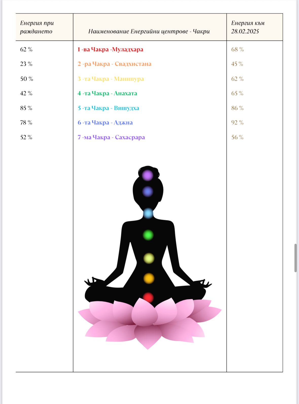 ✨ Енергията на чакрите при раждането – ще разберете каква енергия сте наследили от рода си (в %) и как тя влияе на вашето личностно развитие.